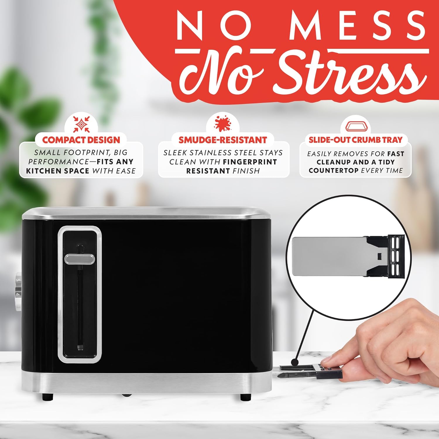 Where is the crumb tray located? The removable crumb tray slides out from the bottom rear for easy access.